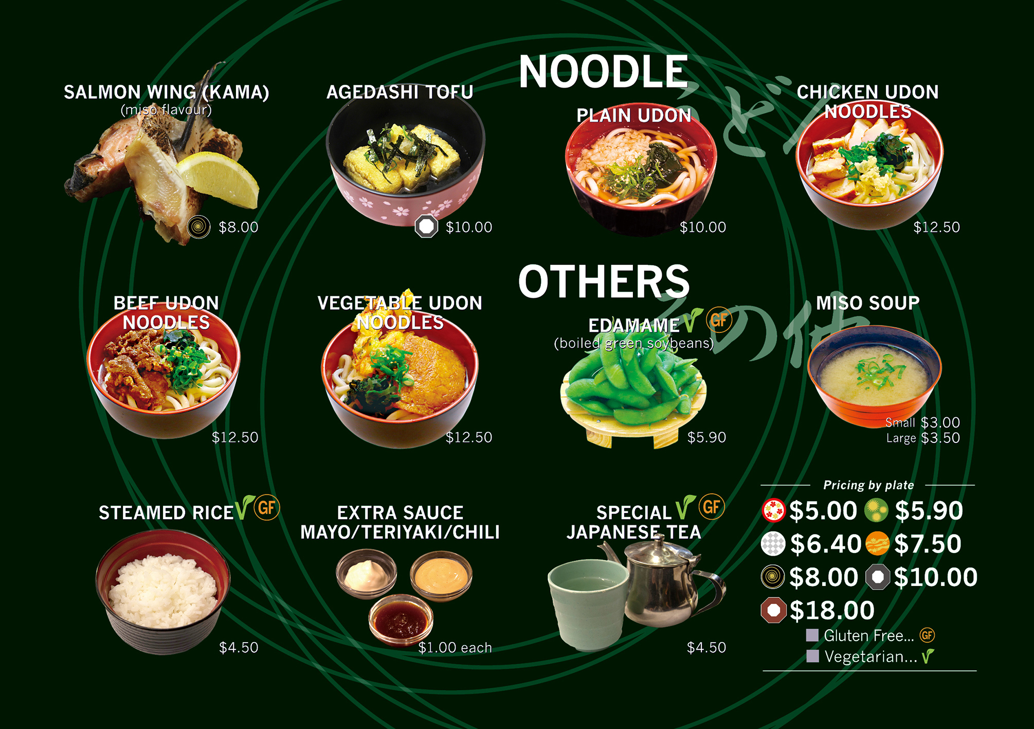 – 50 cents for containers will be charged for Udon Noodle and Salad Takeaway.